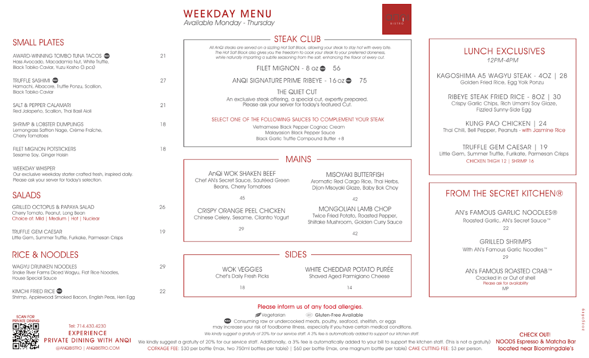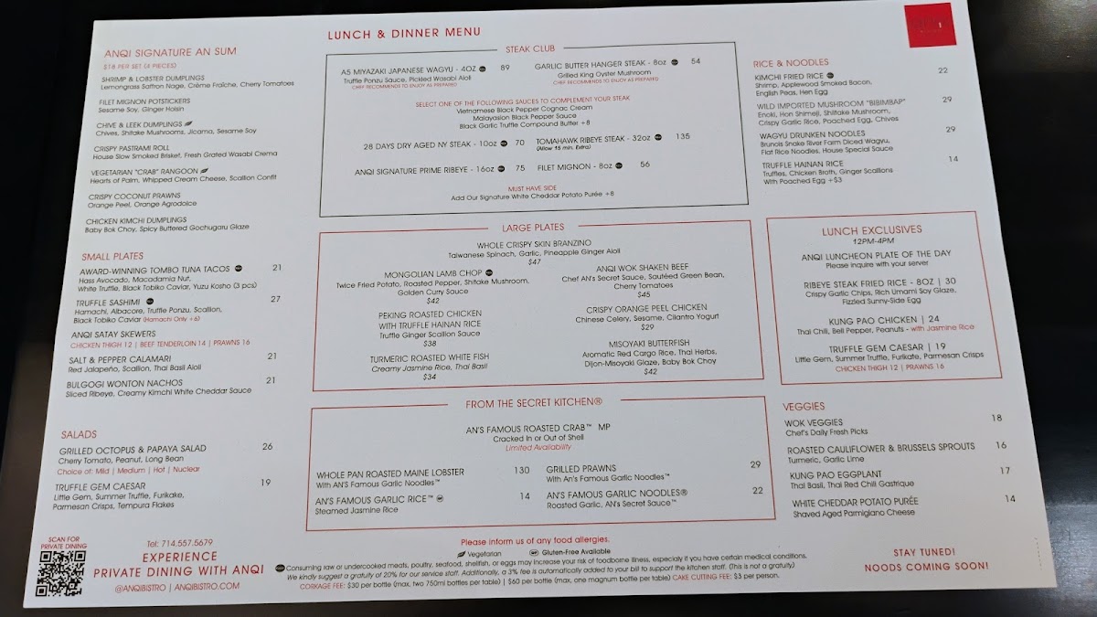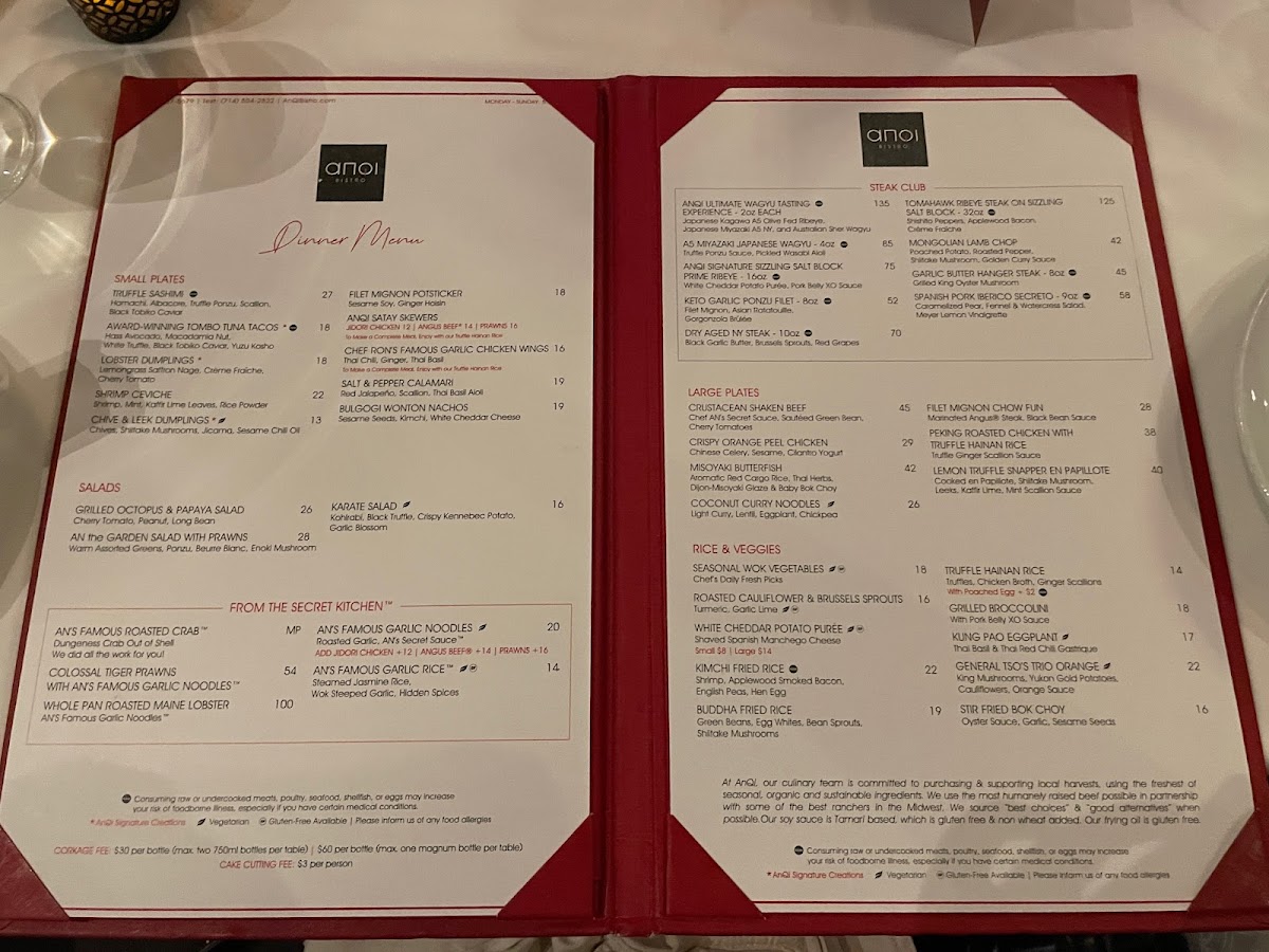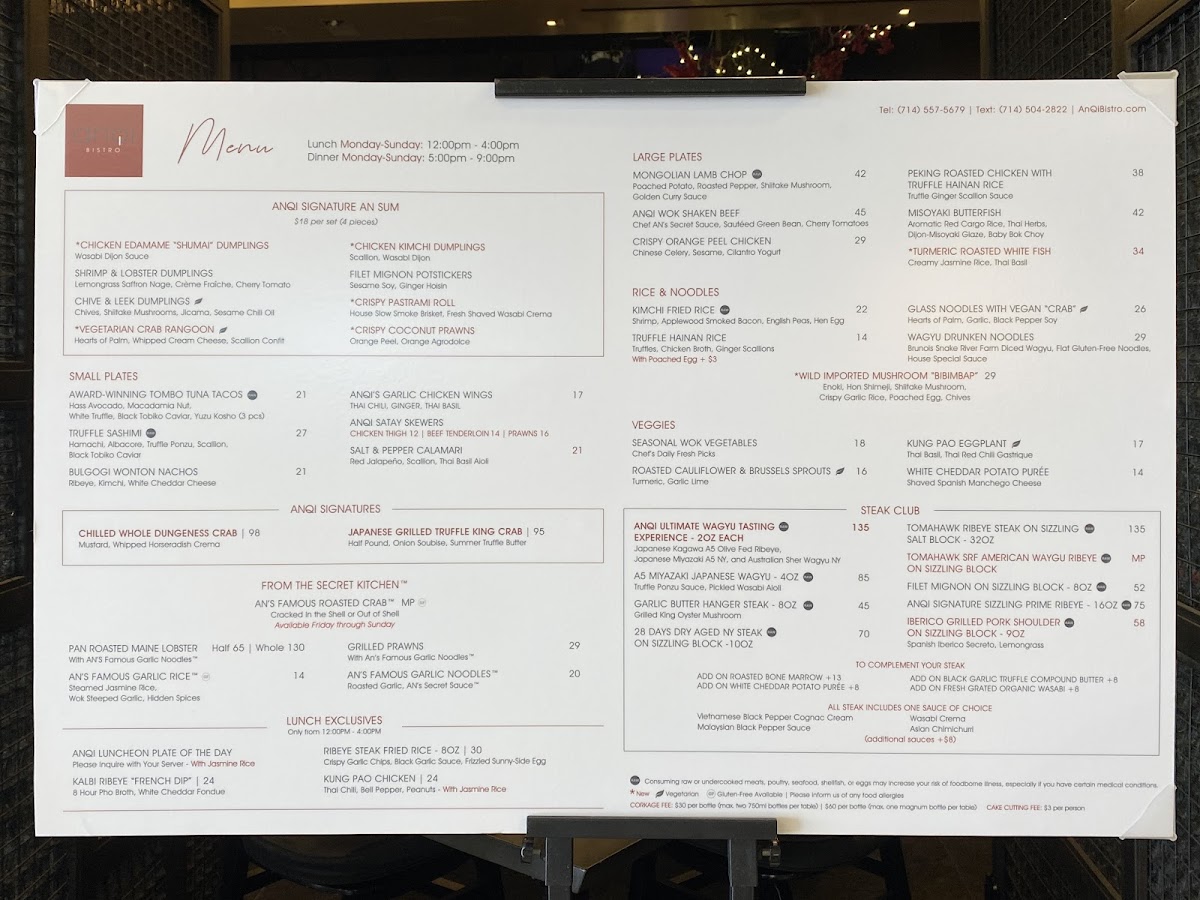 Welcome to AnQi Bistro, a vibrant Asian fusion restaurant located in the heart of Costa Mesa at 3333 Bristol St. This unique dining destination artfully combines traditional Asian flavors with modern culinary techniques, creating a menu that is not just a meal but a memorable experience. As you walk through the doors, you'll be enveloped by a warm and inviting atmosphere, featuring elegant decor that excites the senses and sets the stage for your dining adventure.